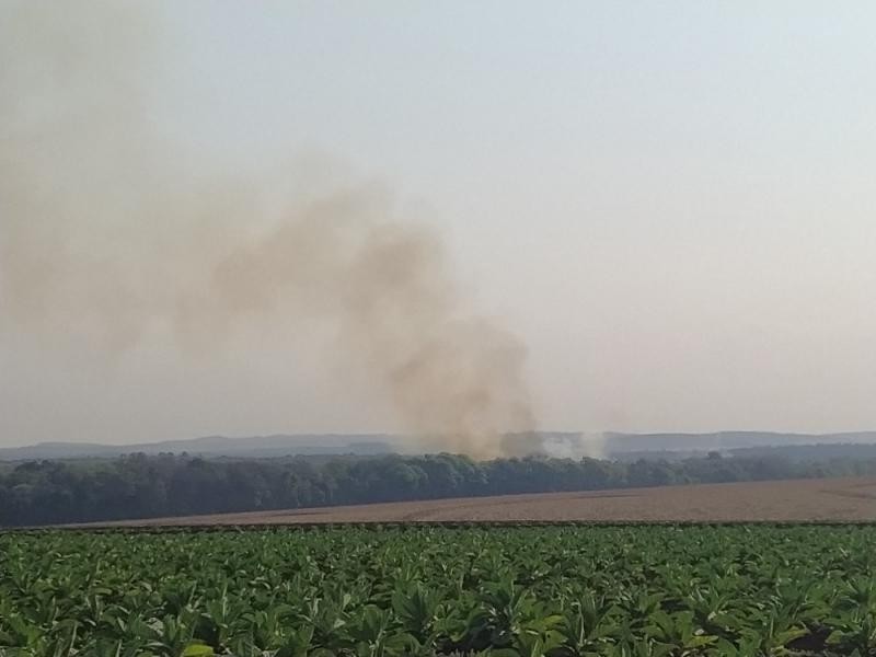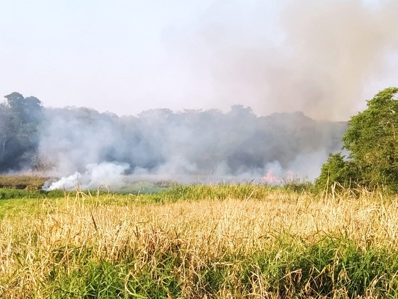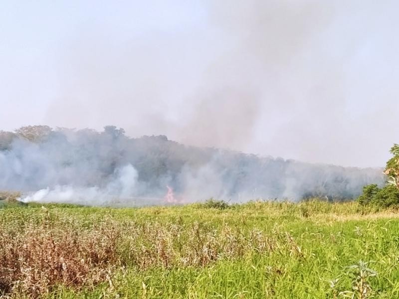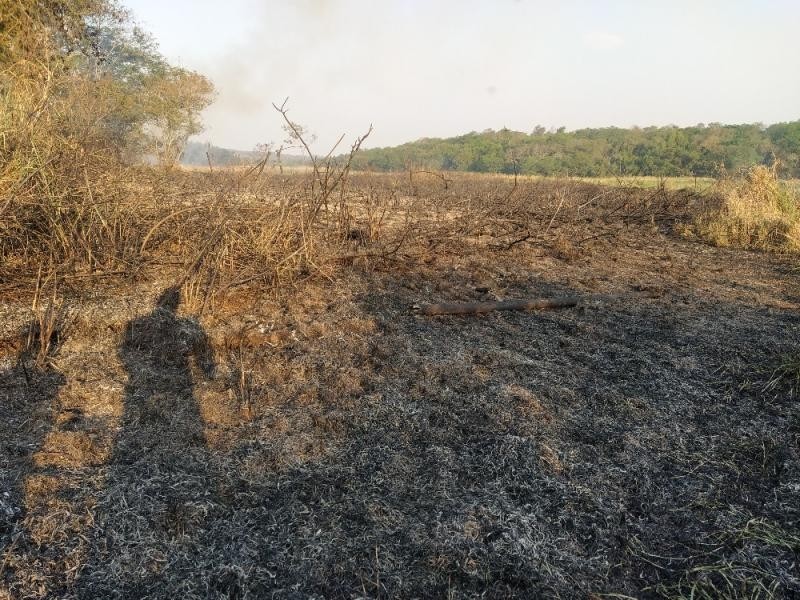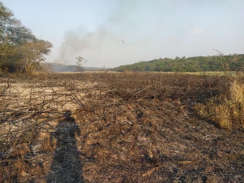 O fogo já consumiu uma grande área e avança em direção à mata ciliar.