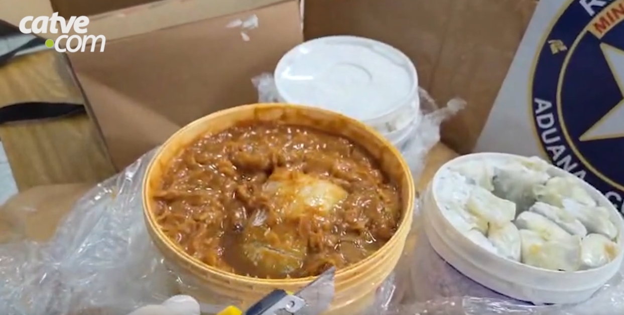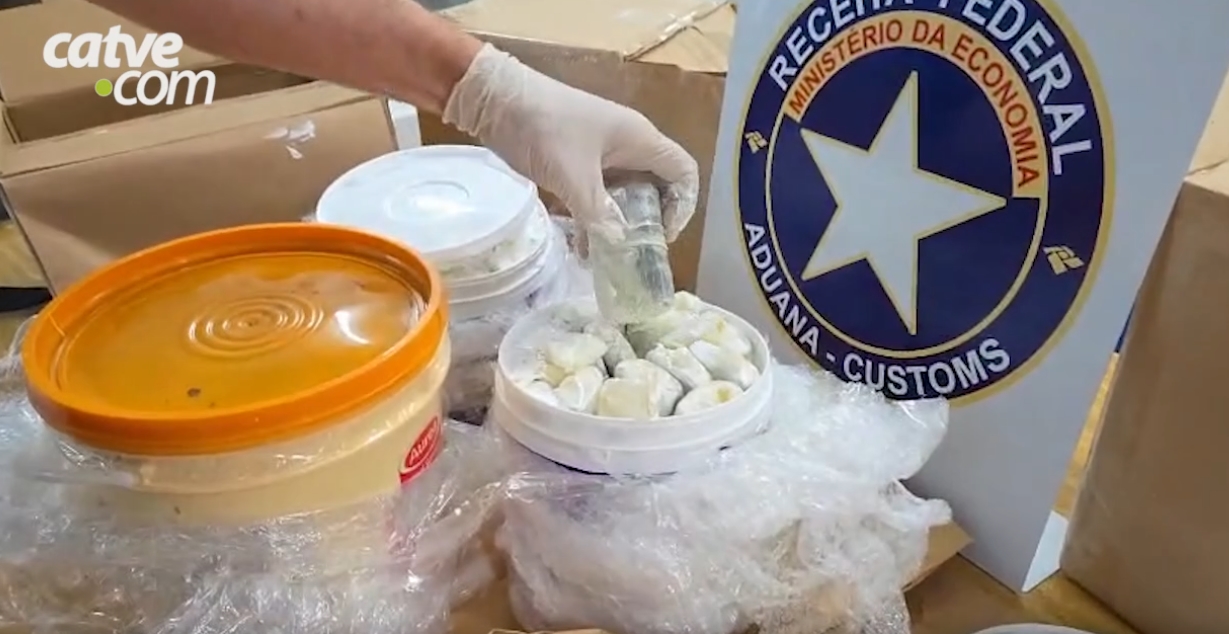 A droga estava escondida em três recipientes: um balde de 10 litros com doce de leite, onde estavam dois pacotes grandes; e dois baldes de 3,6 litros de tinta branca, que continham 60 pacotes embalados com preservativos masculinos.