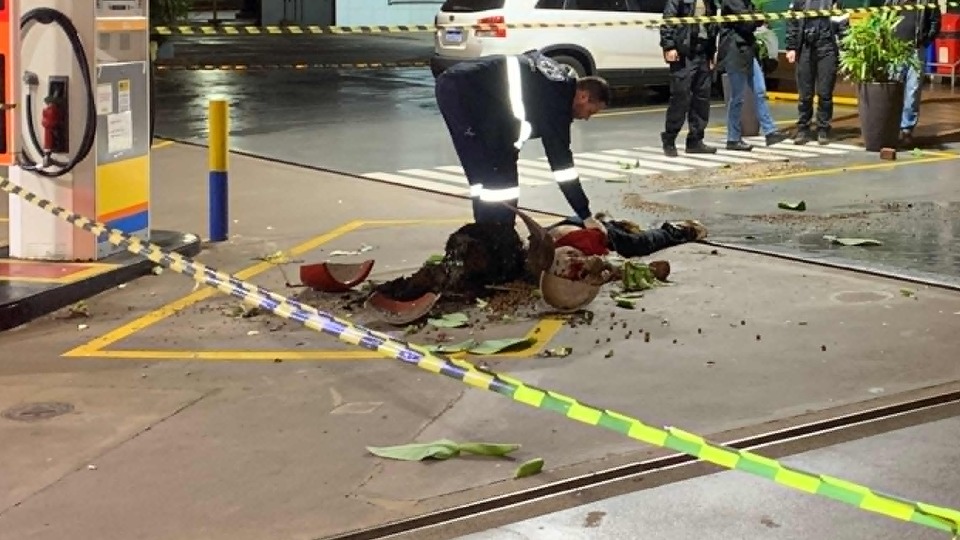 O homicídio ocorreu dentro do pátio do posto de combustíveis, sendo que, a princípio, foi a pessoa espancada até a morte, tento o crânio esmagado com um vaso de planta.