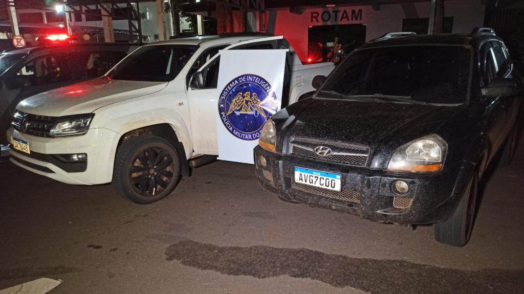 A caminhonete Amarok, branca com alerta de roubo e a Hyundai Tucson com alerta de furto estavam em uma garagem de uma residência do distrito