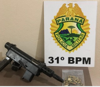 Os policias entraram na moradia e encontraram o denunciado num dos quartos e com ele uma metralhadora calibre 9mm com um carregador vazio.