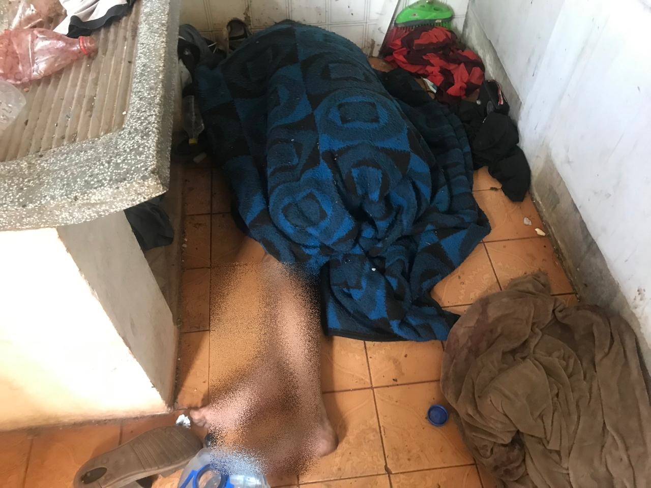 Existem manchas de sangue na parede e o corpo está embaixo de um cobertor, o que supõe a possibilidade de um assassinato.