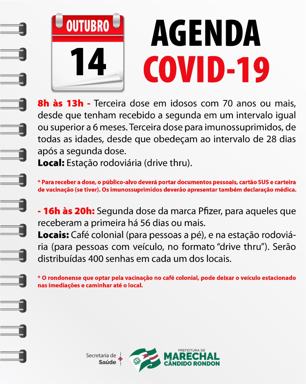A terceira dose da vacina contra a Covid-19 será aplicada, novamente, a dois grupos prioritários nesta quinta-feira (14), em Marechal Cândido Rondon. O atendimento será das 8h às 13h, somente na estação rodoviária (para pessoas com veículo, no formato “drive thru”).