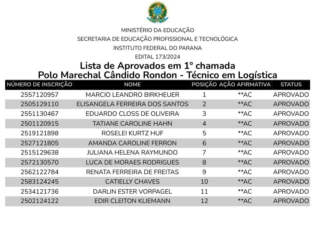 O Instituto Federal do Paraná (IFPR) divulgou a lista de candidatos aprovados no processo seletivo na modalidade de Educação a Distância (EaD) para o polo de Marechal Cândido Rondon.