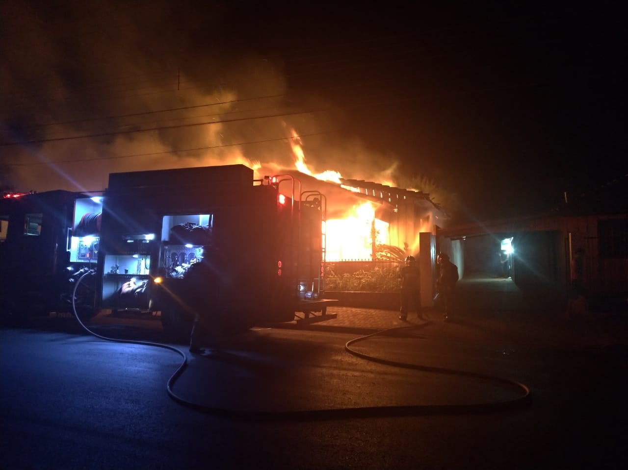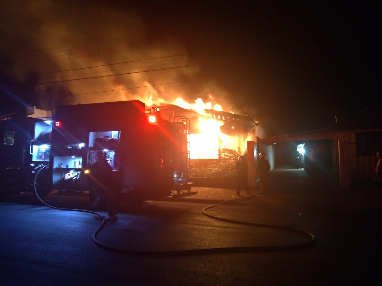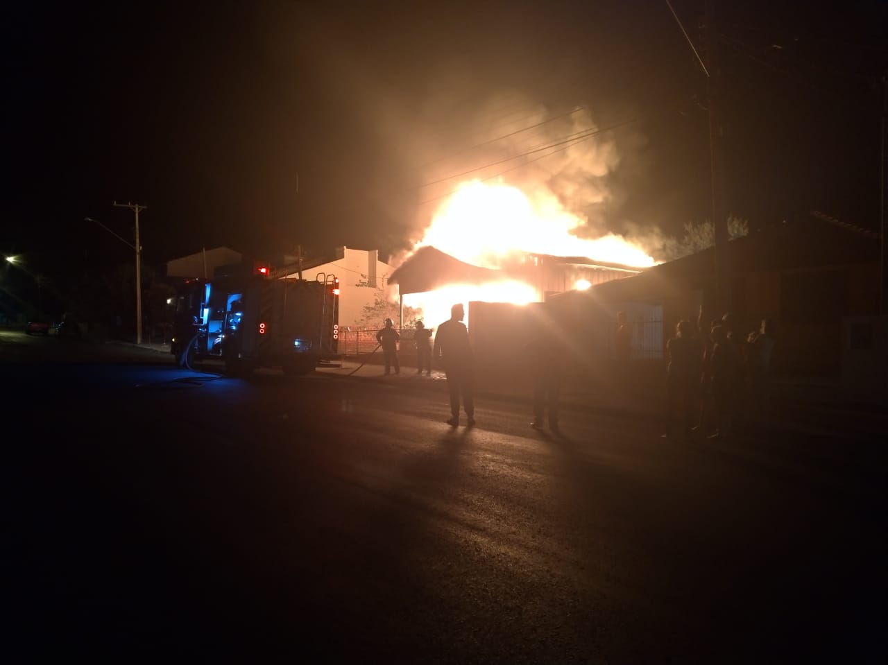 Uma residência de madeira foi completamente destruída pelo fogo e os bombeiros tiveram muito trabalho para evitar que as chamas atingissem imóveis vizinhos, já que o vento era forte no momento da ação.