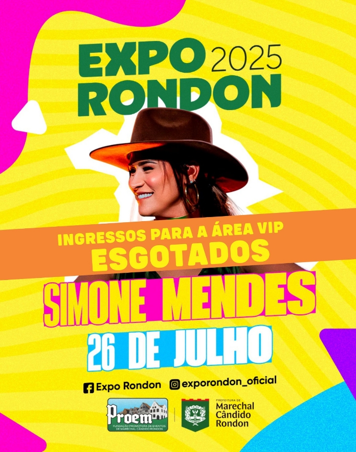 No sábado, dia 5, foram vendidos os últimos ingressos para a área VIP do show da cantora Simone Mendes, que acontecerá no dia 26 de julho, no estádio municipal, como parte da programação musical da Expo Rondon 2025. Para os demais shows, ainda restam ingressos disponíveis para este espaço.