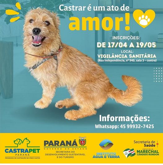 Encerram-se na sexta-feira (19), em Marechal Cândido Rondon, as inscrições para a castração de cães e gatos através do programa Castrapet, do governo do estado. No município a parceria é com a Secretaria de Saúde, através do setor de Vigilância Sanitária. Conforme levantamento realizado, ainda restam vagas para felinos e caninos machos.