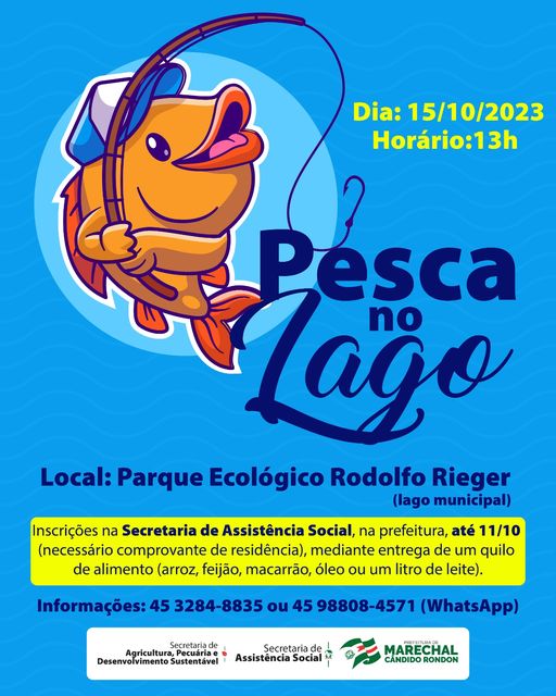 A prefeitura de Marechal Cândido Rondon, através da Secretaria de Assistência Social, com o apoio da Secretaria de Agricultura, Pecuária e Desenvolvimento Sustentável, promove mais uma edição da Pesca no Lago. O evento também terá a participação do grupo Free Life, que está participando da 6ª Gincana dos Jovens Lindeiros Ligados à Vida.