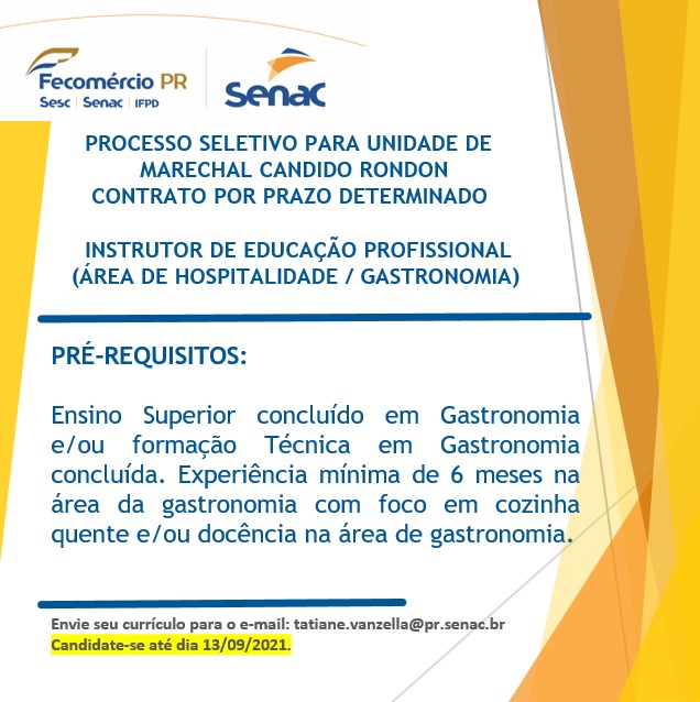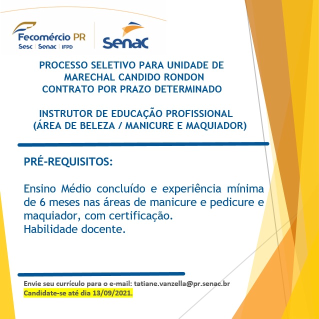 O Senac de Marechal Rondon encerra nesta segunda-feira (13) o prazo de inscrição para os interessados em participar de processos seletivos, para instrutores de educação profissional: são ofertadas vagas para a área de beleza; manicure e maquiador; e na área de hospitalidade e gastronomia.