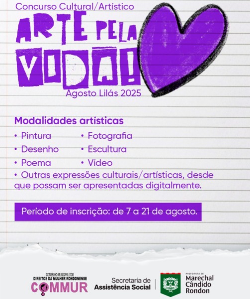 O Conselho Municipal dos Direitos da Mulher Rondonense (COMMUR), em parceria com a Secretaria Municipal de Assistência Social, desenvolve o Concurso Cultural/Artístico “Arte Pela Vida – Agosto Lilás 2025”, como parte da campanha de conscientização pelo fim da violência contra a mulher.