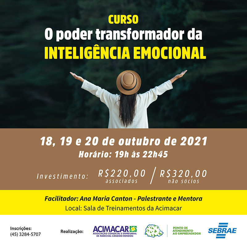 O Ponto de Atendimento ao Empreendedor do Sebrae e a Associação Comercial e Empresarial de Marechal Cândido Rondon (Acimacar) promovem, entre os dias 18 a 20 de outubro, o curso “O poder transformador da Inteligência Emocional”.