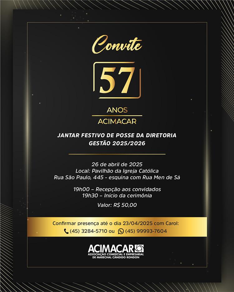 “Convidamos todos os associados para celebrarem este momento especial conosco, comemorando mais um ano próspero em que a Acimacar segue escrevendo uma bela história de sucesso. Continuamos firmes na defesa das bandeiras que impulsionam o setor empresarial e promovem o desenvolvimento de toda a comunidade rondonense”, convida a presidente.
