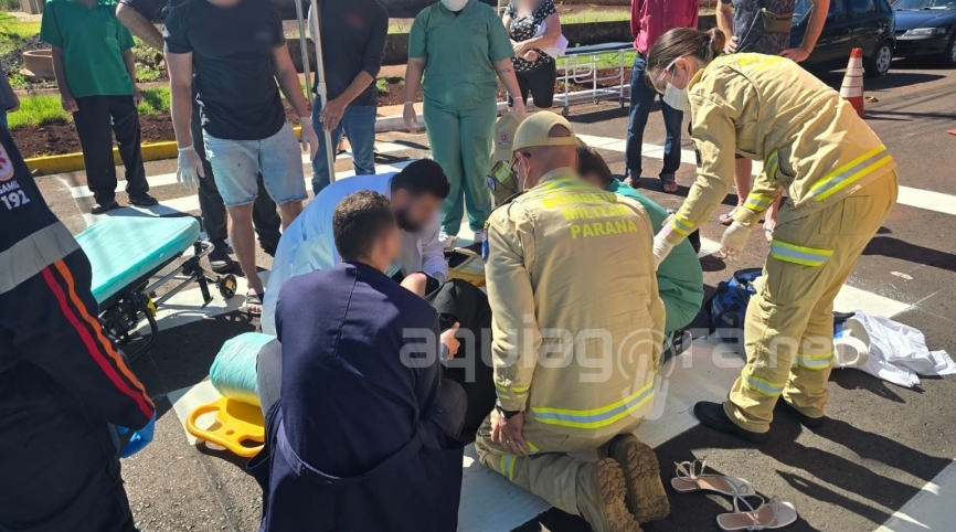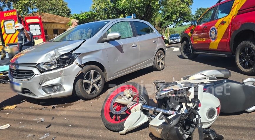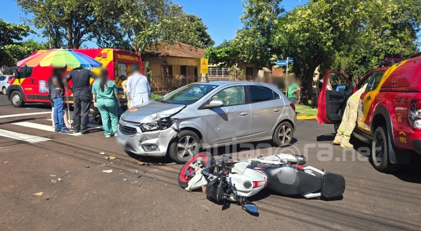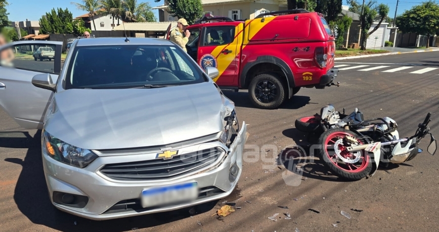 Jovem de 18 anos resulta com suspeita de fratura após grave acidente entre carro e moto no centro de Marechal Rondon