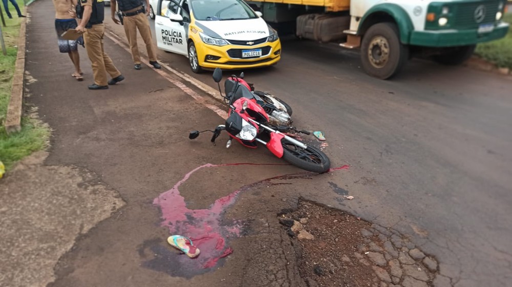 A motocicleta que estava sentido, ao lado da carreta, quando o rodado traseiro do bitren atingiu a moto e a perna da rondonense de 27 anos, que pilotava a mesma.