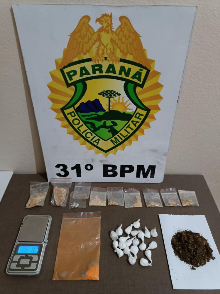Também foram apreendidos um pote contendo 21 porções de cocaína pesando aproximadamente 12,5g, 5 comprimidos de droga sintética e pedrinhas de crack.