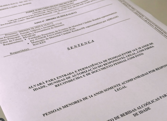 O juiz substituto na Seção Judiciária de Marechal Cândido Rondon, Eric Bortoletto Fontes, expediu sentença referente a pedido encaminhado pela prefeitura de Marechal Cândido Rondon e pela PROEM (Fundação Promotora de Eventos), para a Vara da Infância e da Juventude, referente à autorização judicial para a entrada e permanência de menores de 18 anos no parque de exposições, durante a Expo Rondon 2025, que acontecerá de 23 a 27 de julho.