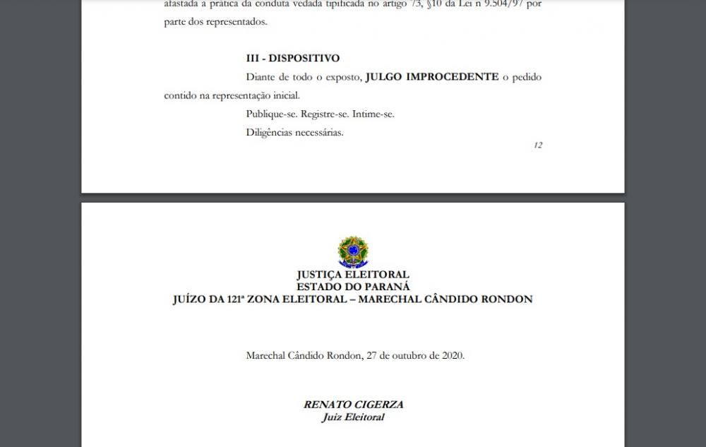 O juiz Renato Cigerza, da 121ª Zona Eleitoral de Marechal Cândido Rondon não aceitou os argumentos da coligação “Meu voto de fé”, do candidato a prefeito Josoé Pedralli, que pretendia impugnar o registro da candidatura de Marcio e Ila. O magistrado julgou improcedente a representação que denunciava prática de conduta vedada em ano eleitoral por conta da implantação do programa “Remédio em Casa”, da Prefeitura.