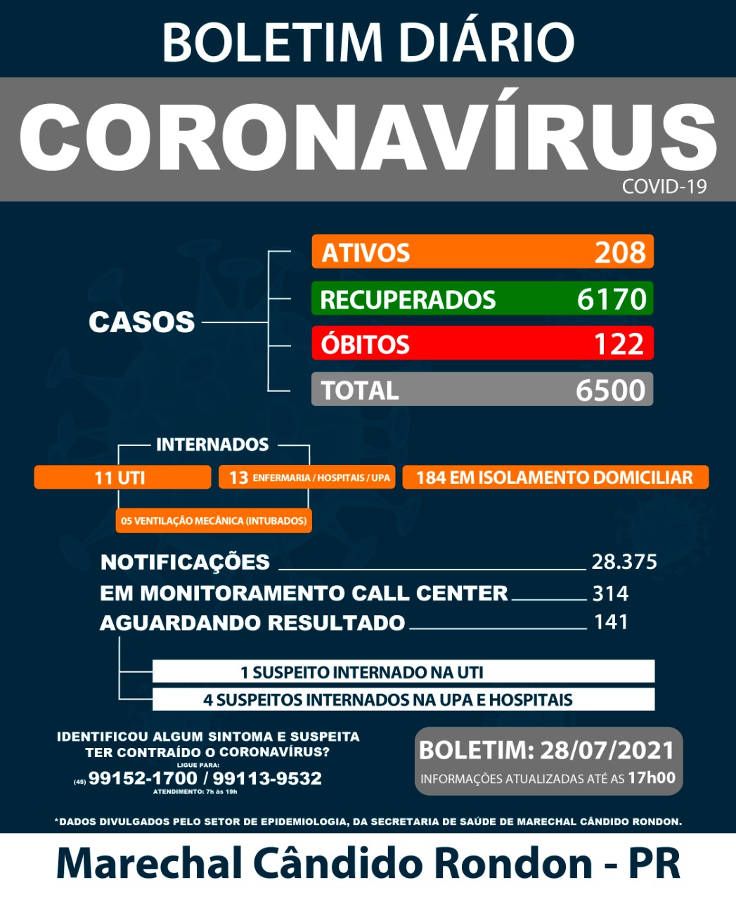 Conforme o boletim divulgado pelo Setor de Epidemiologia, Marechal Cândido Rondon tem 208 casos ativos de covid-19, com 11 pessoas na UTI; 13 em enfermaria, hospitais e UPA; e 184 em isolamento domiciliar.