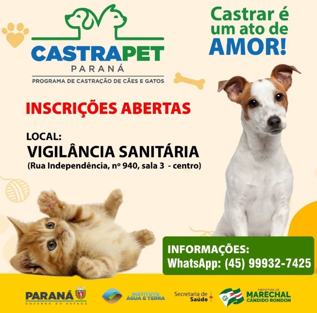 O Programa Permanente de Esterilização de Cães e Gatos (CastraPet Paraná), que visa controlar a população de cães e gatos, além de prevenir zoonoses, terá uma nova fase em Marechal Cândido Rondon. Trata-se de uma ação da Secretaria de Estado do Desenvolvimento Sustentável e do Turismo (Sedest), com o apoio da Secretaria de Saúde rondonense, através da Vigilância Sanitária.