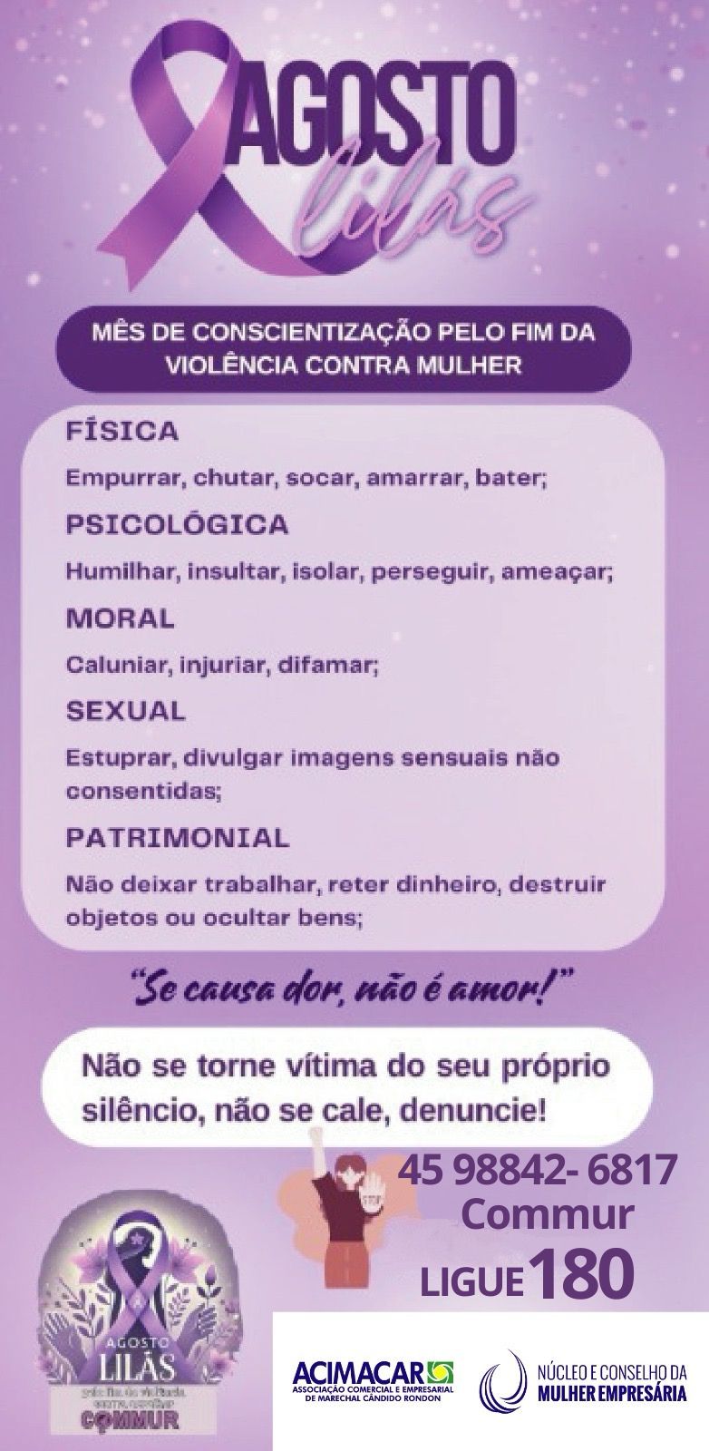Marechal Rondon registra ações do mês Agosto Lilás, uma campanha de prevenção e conscientização contra a violência doméstica e familiar contra a mulher.