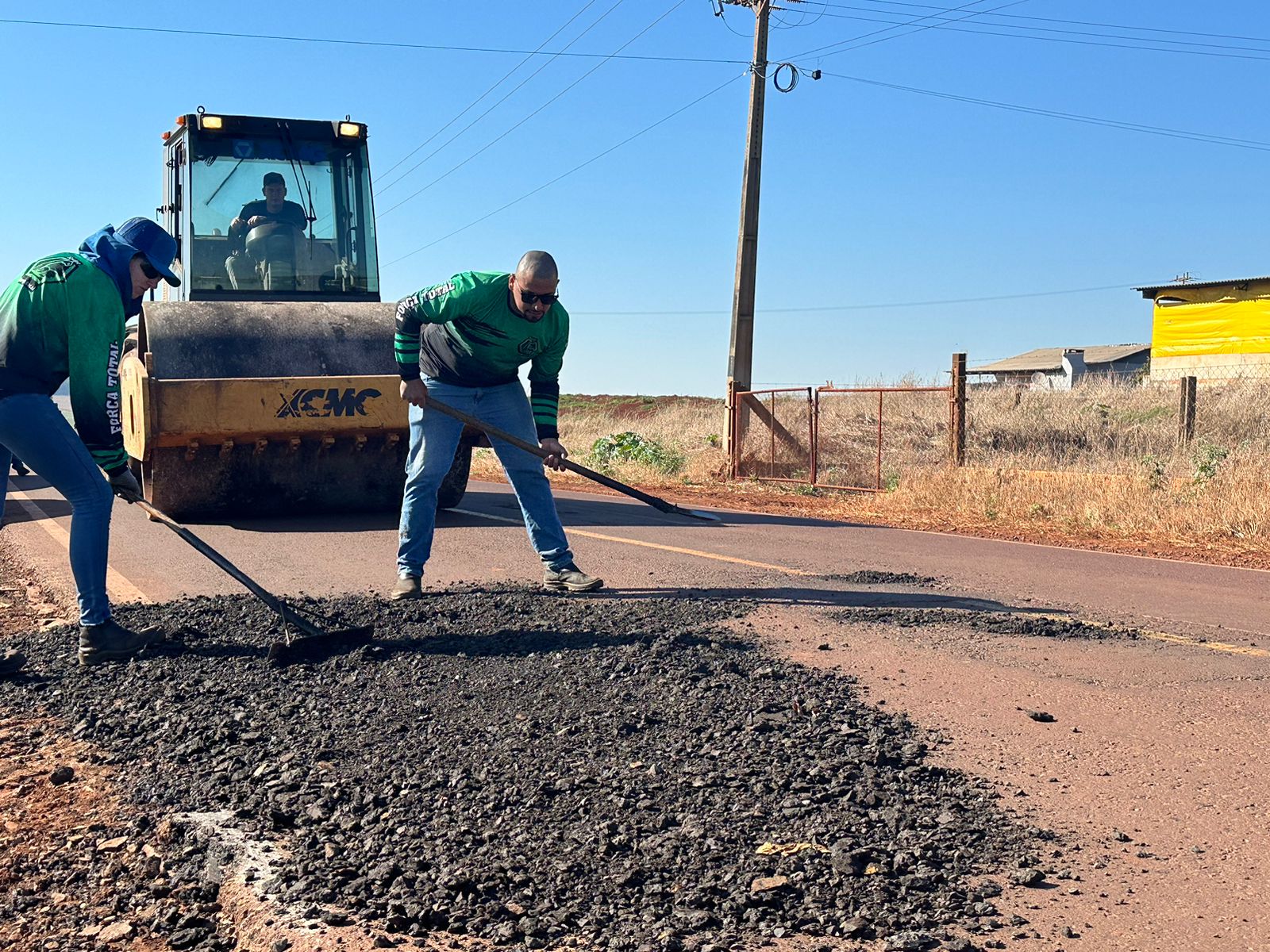 O trabalho consiste na colocação de fresa de asfalto em locais danificados da estrada, com compactação dos trechos que estão recebendo o material.