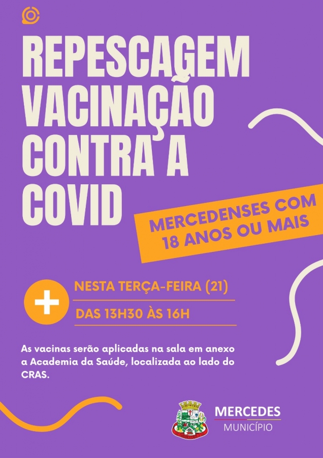 O município de Mercedes realiza nesta terça-feira (21) a repescagem da vacinação contra a Covid-19 para todos os moradores com 18 anos ou mais.
