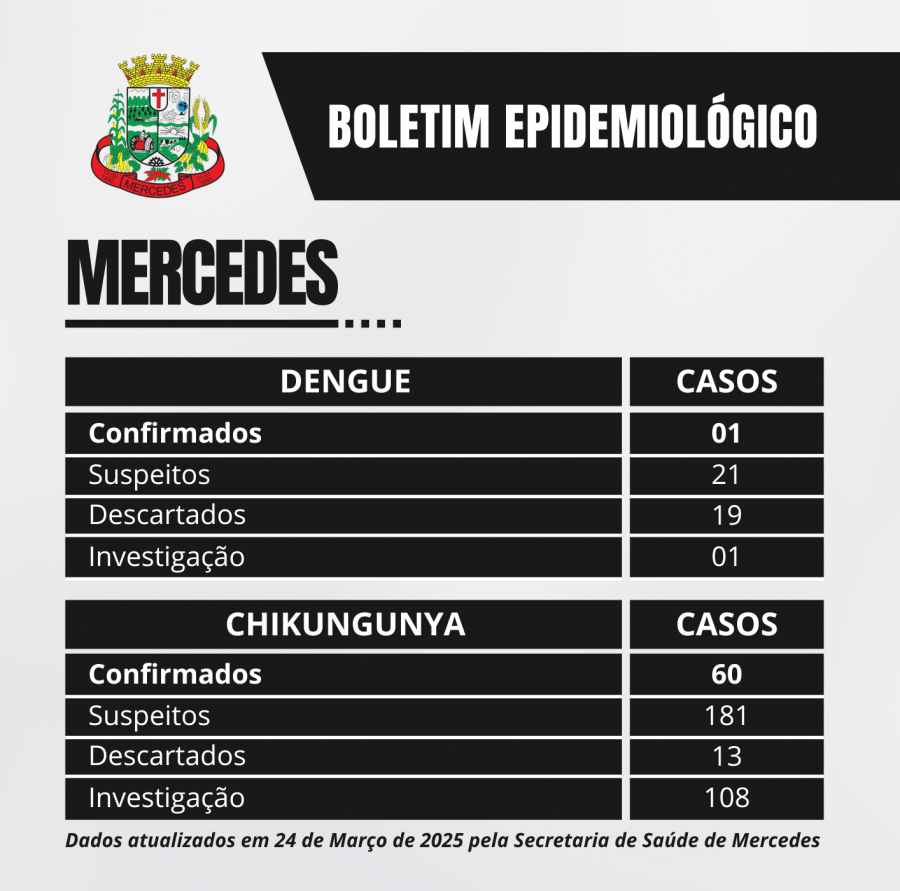O novo boletim da Secretaria de Saúde de Mercedes, divulgado nesta segunda-feira (24), confirma 60 casos de febre Chikungunya e um caso de dengue no município. Em comparação com a semana anterior, houve um aumento significativo de 34 casos. O boletim traz ainda 108 casos de Chikungunya e um de dengue que estão em investigação.
