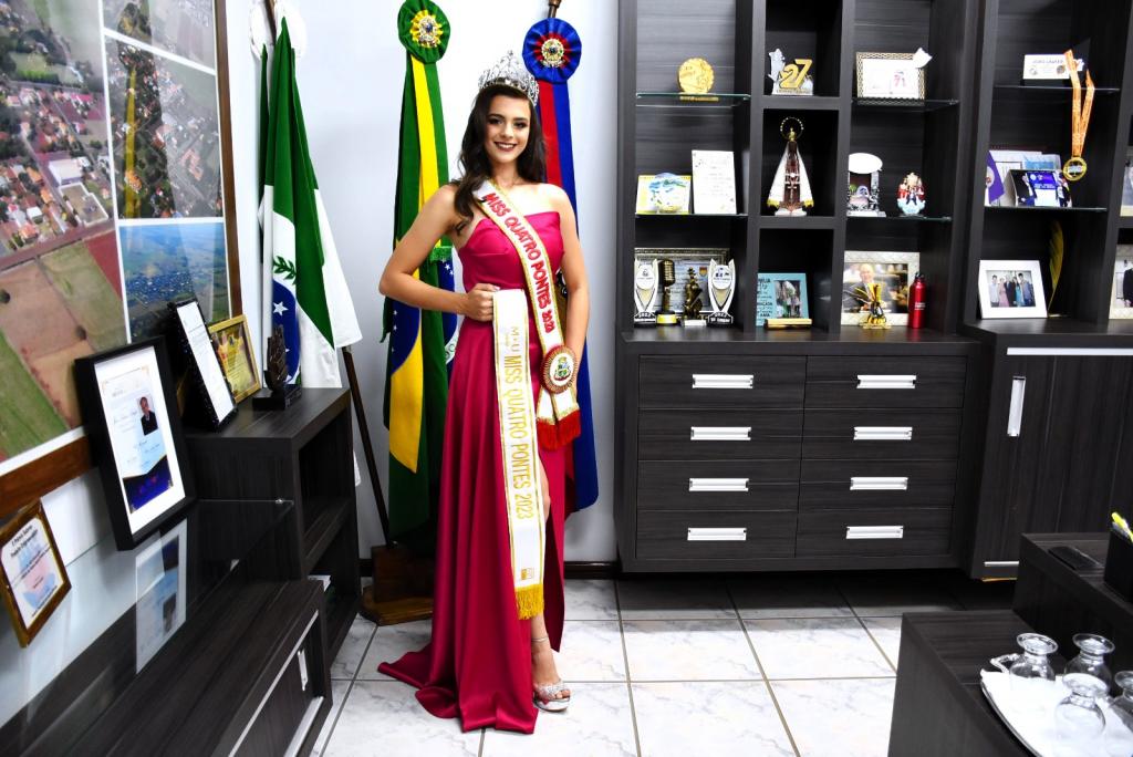 A Miss Quatro Pontes, Geovanna Rafaela Siebert, que foi eleita representante máxima da beleza feminina quatropontense, no Miss Quatro Pontes 2023, recebeu a faixa que usará no Miss Universo Paraná 2024, concurso em que representará seu município