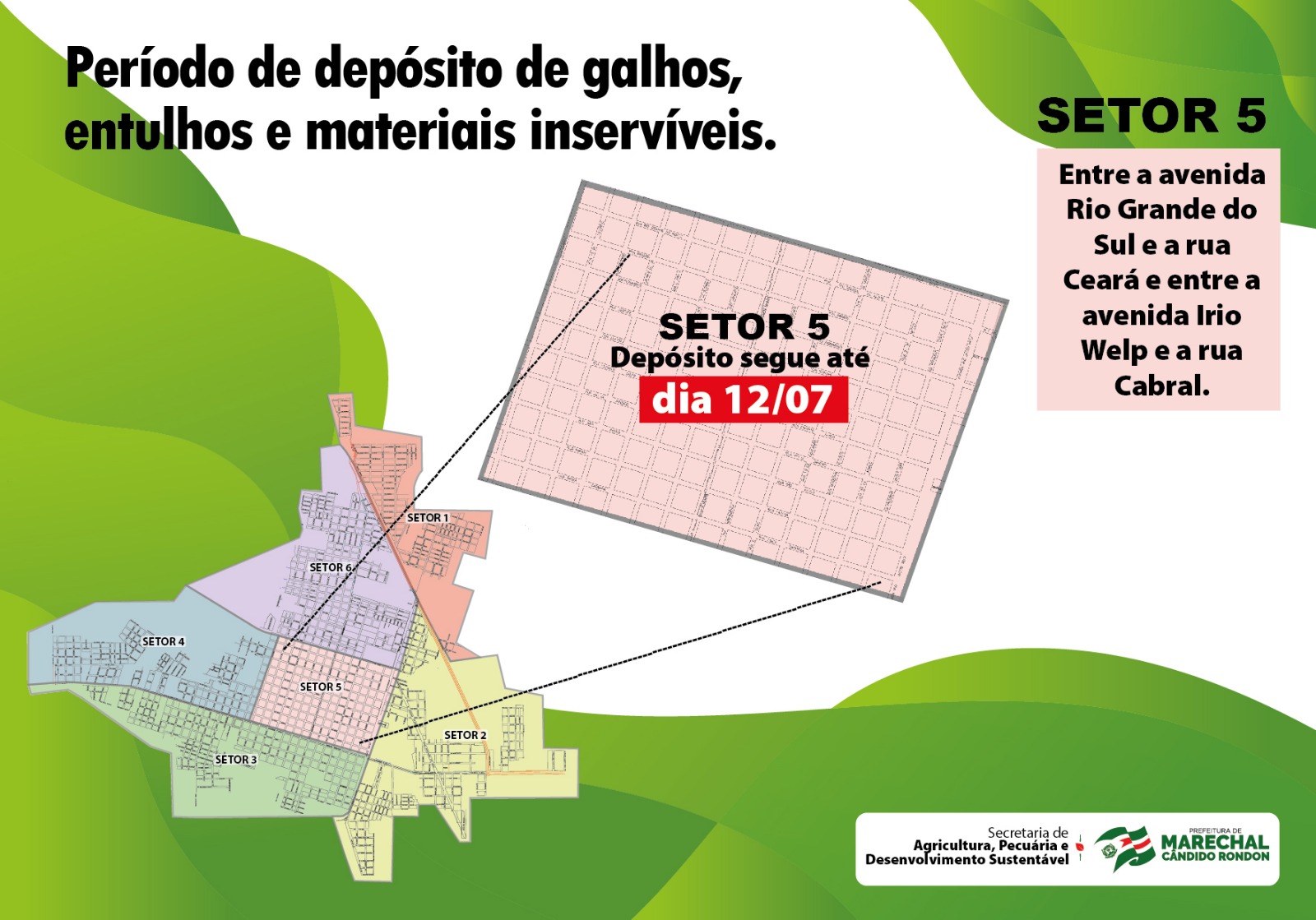 Os moradores do setor 5, que corresponde à região central, entre a avenida Rio Grande do Sul e a rua Ceará, e entre a avenida Irio Welp e a rua Cabral, estão sendo orientados a depositar os materiais em frente às residências até o dia 12 de julho. No dia 13, a recolha será iniciada, não sendo mais permitido o depósito de materiais em via pública, sob pena de multa.