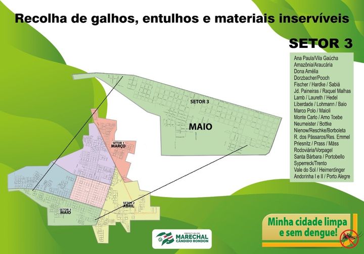 Agora, os moradores do setor 3 estão sendo orientados a depositar galhos e entulhos em frente às residências até o final do mês de maio. Este setor compreende: Ana Paula, Vila Gaúcha, Amazônia, Araucária, Dona Amélia, Dorzbacher, Pooch, Fischer, Hardke, Sabiá, Jardim Paineiras, Raquel Malhas, Lamb, Laureth, Hedel, Liberdade, Lohmann, Baio, Marco Polo, Maioli, Monte Carlo, Arno Toebe, Neumeister, Bootke, Nienow, Reschke, Borboleta, dos Pássaros, Residencial Emmel, Priesnitz, Prass, Mass, Rodoviária, Vorpagel, Santa Bárbara, Portobello, Syperreck, Trento, Vale do Sol, Heimerdinger, Andorinha I e II e Porto Alegre.
