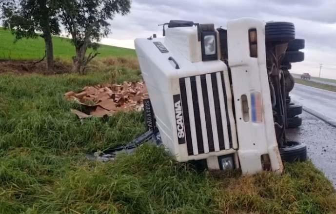 Motorista fica ferido ao tombar caminhão na BR-163, em Cascavel