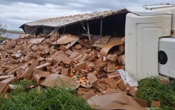 Segundo as informações, o motorista seguia pela via de rolamento quando o para-brisas ficou todo embaçado e ele acabou saindo da pista. Ao trafegar pelo acostamento, o caminhão acabou tombando e derramando a carga.