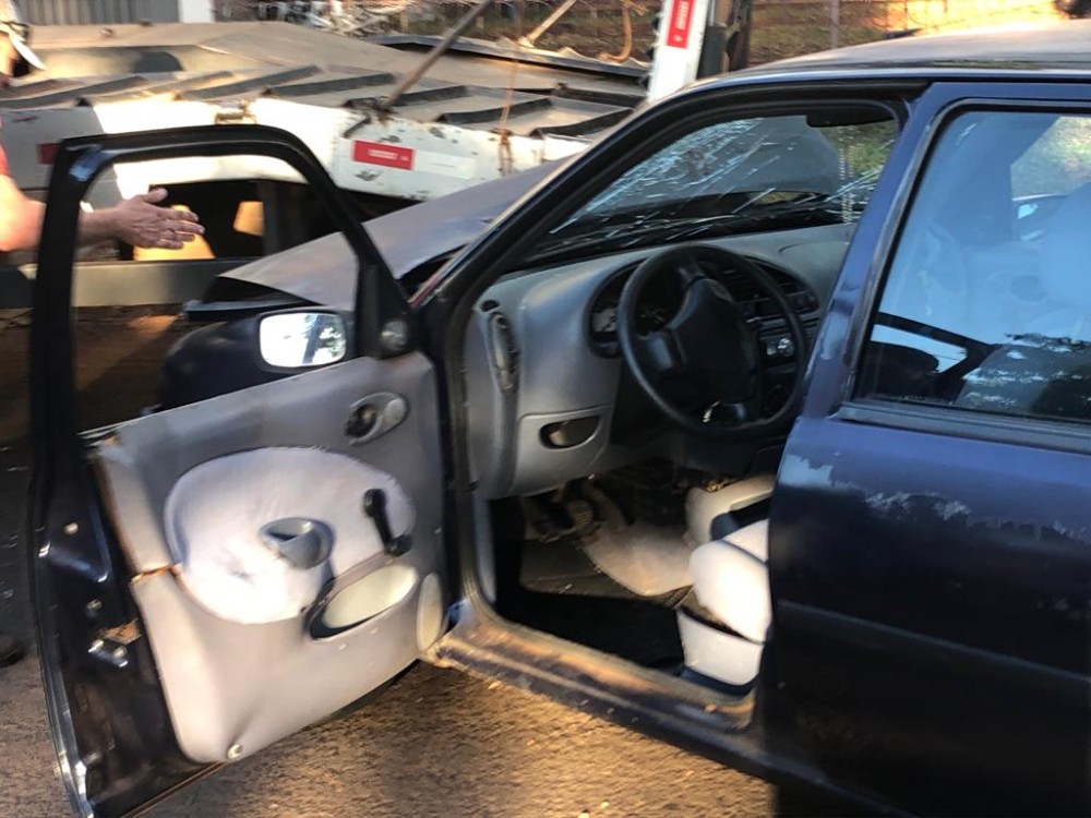 A mulher perdeu o controle do veículo e bateu na traseira do caminhão prancha, sendo que o Fiesta praticamente ficou cravado no caminhão prancha.