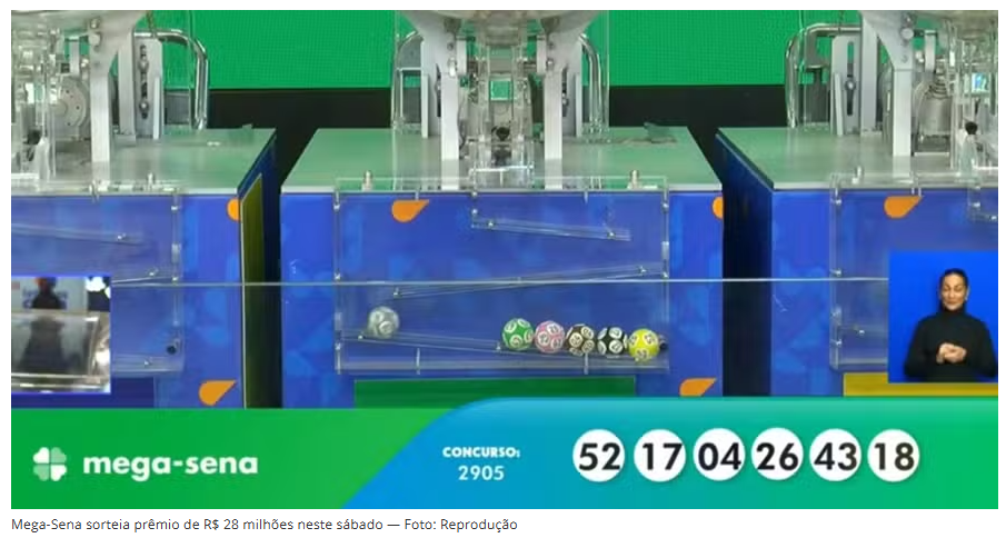 A Caixa Econômica Federal realizou neste sábado o sorteio do concurso 2.905 da Mega-Sena, com um prêmio de R$ 28.071.338,06.