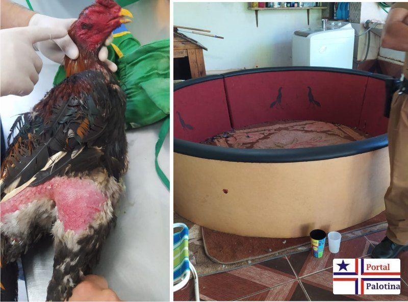 No local, verificou-se a procedência da denúncia, que havia um ringue para a briga, com penas dos animais espalhadas, um galo ferido e outro em estado terminal, além de outros pássaros de origem silvestre.