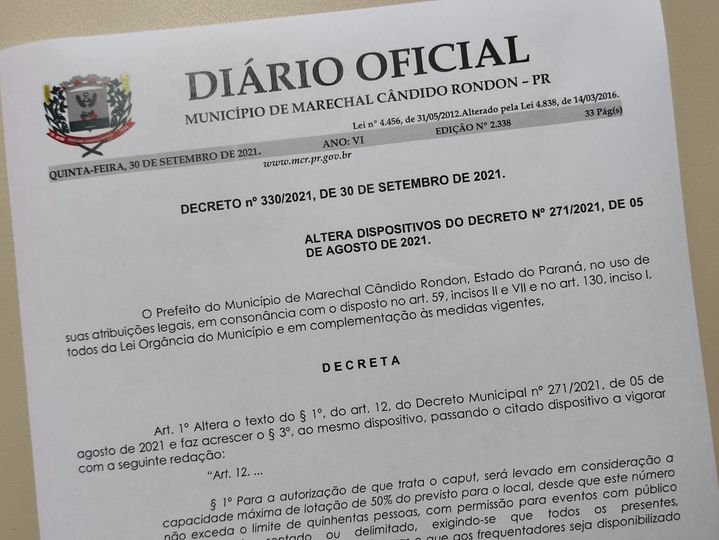 O documento altera o texto do artigo 12, do Decreto Municipal nº 271, de 05 de agosto de 2021, que trata da realização de eventos no município. Antes, a realização de eventos estava condicionada aos critérios do Decreto Estadual 8178, observando que a realização deveria ser aprovada pelo COE.