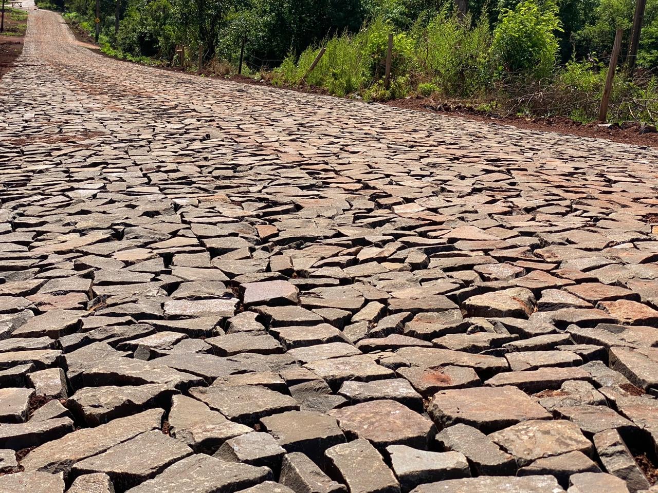A pavimentação com pedras irregulares compreende 7.332m², numa extensão de 1.200 metros.