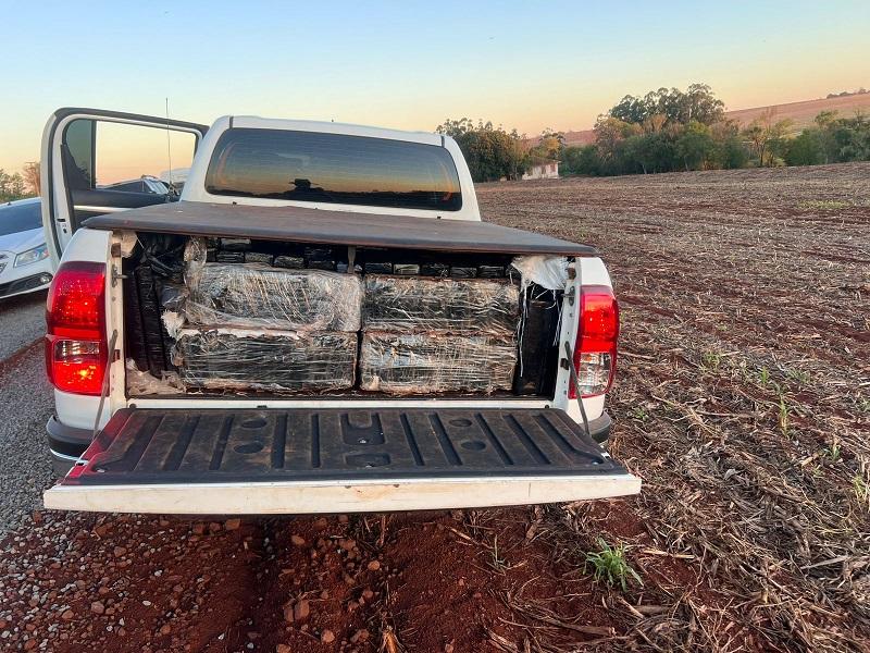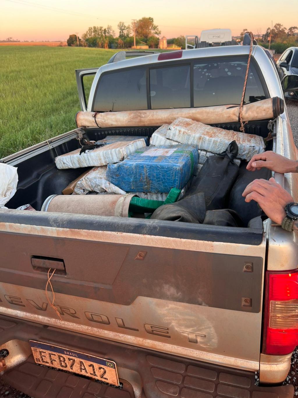 Na ação, foram apreendidos cinco veículos, entre eles uma caminhonete Hilux que ostentava placas falsas e havia sido roubada no Rio Grande do Sul em abril deste ano. No local, as autoridades encontraram drogas escondidas em diferentes pontos da propriedade: dentro de fardos de feno, em barris, câmaras pneumáticas e até em cômodos da residência.