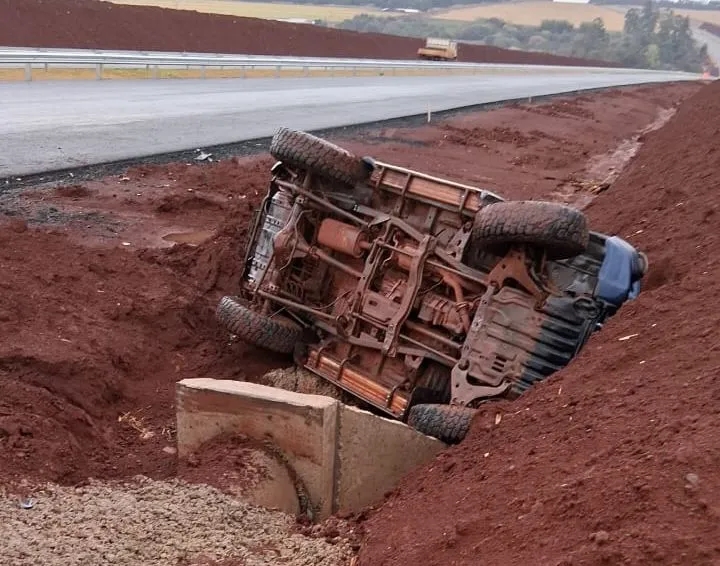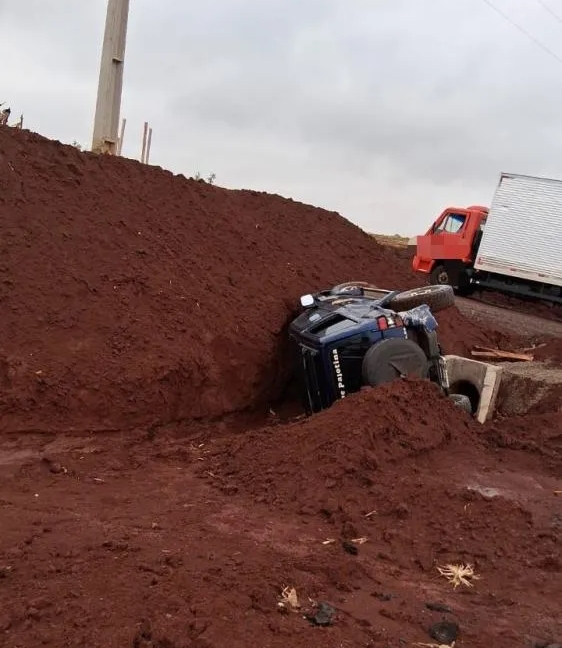 A colisão envolveu um carro e um caminhão. Com o impacto, o automóvel acabou sendo lançado para dentro de uma valeta existente no local, parte das obras do contorno.