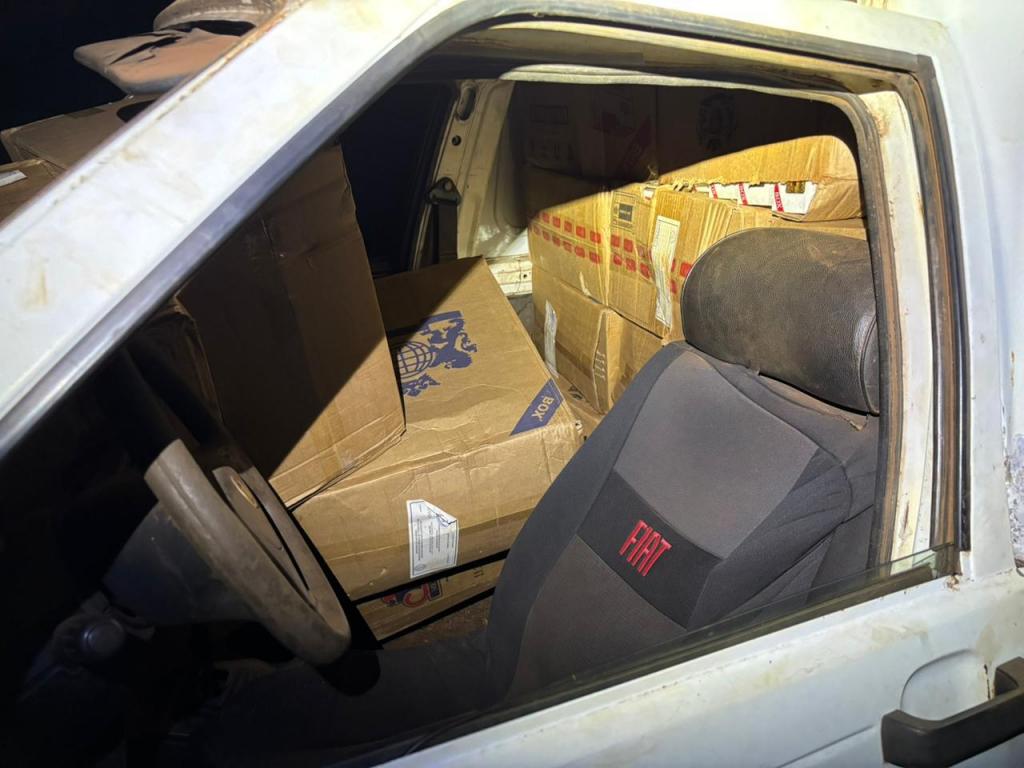 Na quarta-feira (04), uma ação conjunta da Polícia Federal e do BPFron resultou na apreensão de um veículo Fiat Fiorino carregado com 2.000 pacotes de cigarros contrabandeados do Paraguai. A ocorrência foi registrada em uma plantação de eucalipto, entre Porto Mendes e Mercedes, durante a Operação Acero.