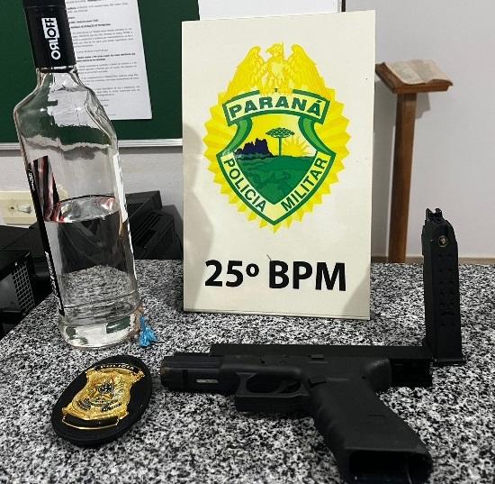 Os policiais encontraram um simulacro de pistola com um carregador, uma garrafa de vodka, uma bucha de cocaina e um distintivo de polícia. O homem foi encaminhado ao Destacamento da Polícia Militar de Brasilândia do Sul e depois ao hospital municipal de Iporã.