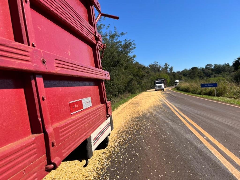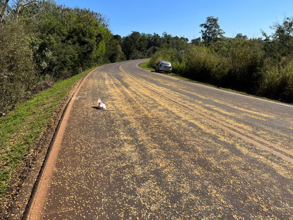 Quem estiver passando pelo local, deve ter muita cautela, pois a pista acabou ficando escorregadia com o milho.
