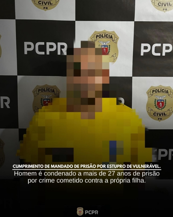 Nesta segunda-feira (18/08/2025), a equipe da 47ª Delegacia Regional de Polícia de Marechal Cândido Rondon deu cumprimento a mandado de prisão em desfavor de um homem de 37 anos, condenado a 27 anos e 8 meses de reclusão pela prática do crime de estupro de vulnerável, ocorrido em 2020, tendo como vítima sua própria filha.