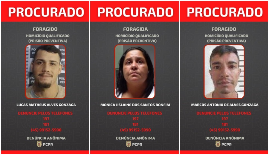 Os procurados são Lucas Matheus Alves Gonzaga, Monica Jislaine dos Santos Bonfim e Marcos Antonio de Alves Gonzaga. A Polícia Civil solicita a colaboração da população para localizá-los e garante o sigilo das informações.