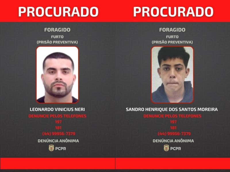 A Polícia Civil do Paraná (PCPR) divulgou nesta terça-feira (20), as fotos de dois homens, de 18 e 24 anos, foragidos pela prática de um furto em uma Universidade de Guaíra. O ato foi flagrado por câmeras de segurança.
