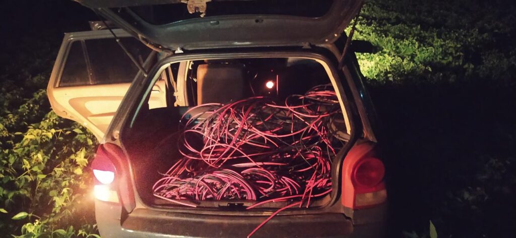 Durante a operação, dois homens, com idades entre 25 e 35 anos, foram presos em flagrante transportando uma grande quantidade de cabos de energia elétrica furtados de uma propriedade localizada na Linha São Salvador, zona rural do município.