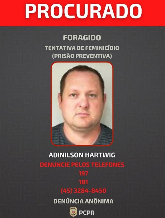 A Polícia Civil do Paraná divulgou ontem, quarta-feira (4), a foto de um homem de 40 anos, investigado por dupla tentativa de feminicídio.