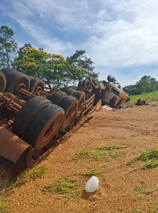 Tombamento de um caminhão Scania carregado com soja a granel foi registrado pela Policia Rodoviária Estadual nesta segunda-feira (22) na PR-488 , trecho Diamante do Oeste a Santa Helena