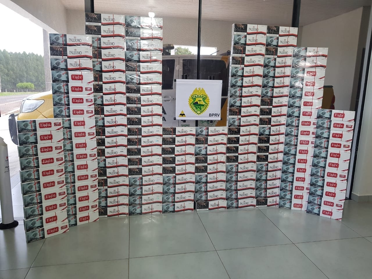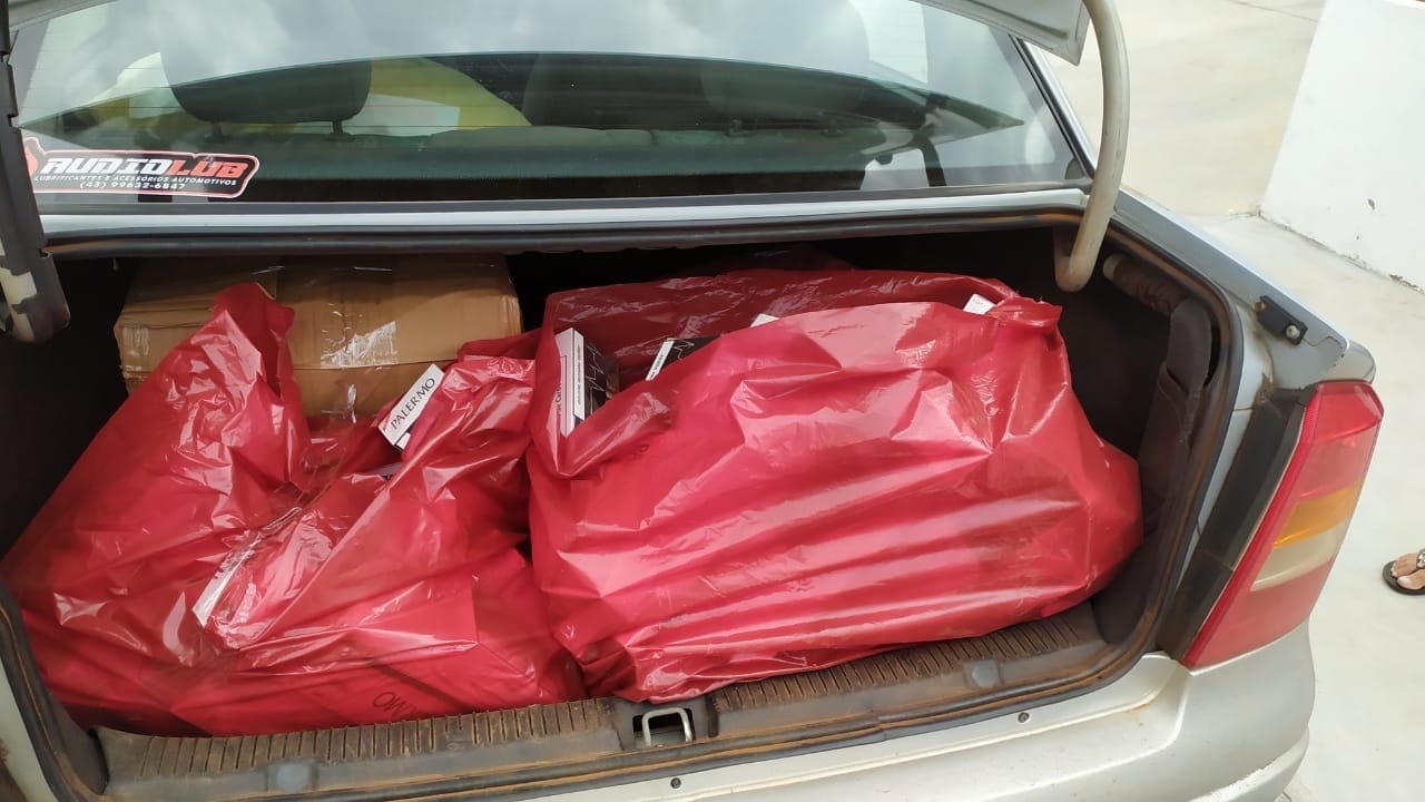 Foi solicitado ao condutor do veículo que apresentassem seus documentos pessoais e do veículo, após verificado que todos estavam regulares, sem nenhum tipo de débitos ou alertas de furto ou roubo, foi realizado uma busca no interior do veículo com o consentimento dos ocupantes, onde fora encontrado pacotes de cigarros de diversas marcas oriundos do país vizinho, Paraguai, acomodados no porta-malas.