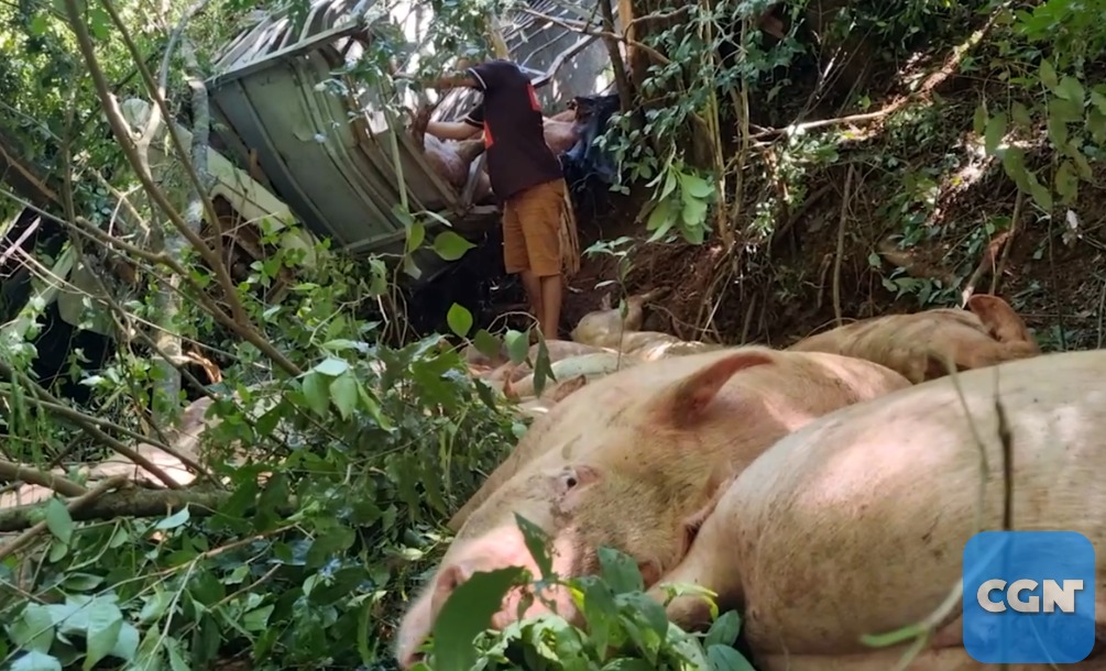 De acordo com as informações apuradas no local, o caminhão estava carregado com porcos e, com a queda, alguns dos animais não sobreviveram. As circunstâncias que levaram à saída de pista ainda serão apuradas.